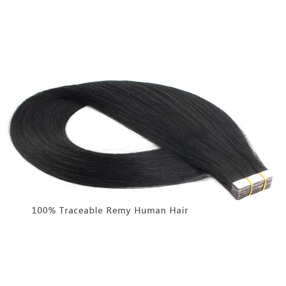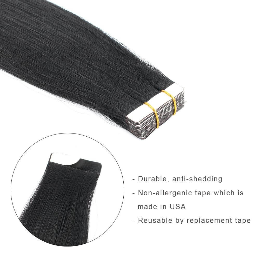 LuxuryYuan Darkest Color Jet Black Hair 14-22 Inch Invisible Tape In Remy Hair Extensions. High Quality 100% Human Tape In Hair Extensions Are The Perfect Way To Add Volume & Length For Women.