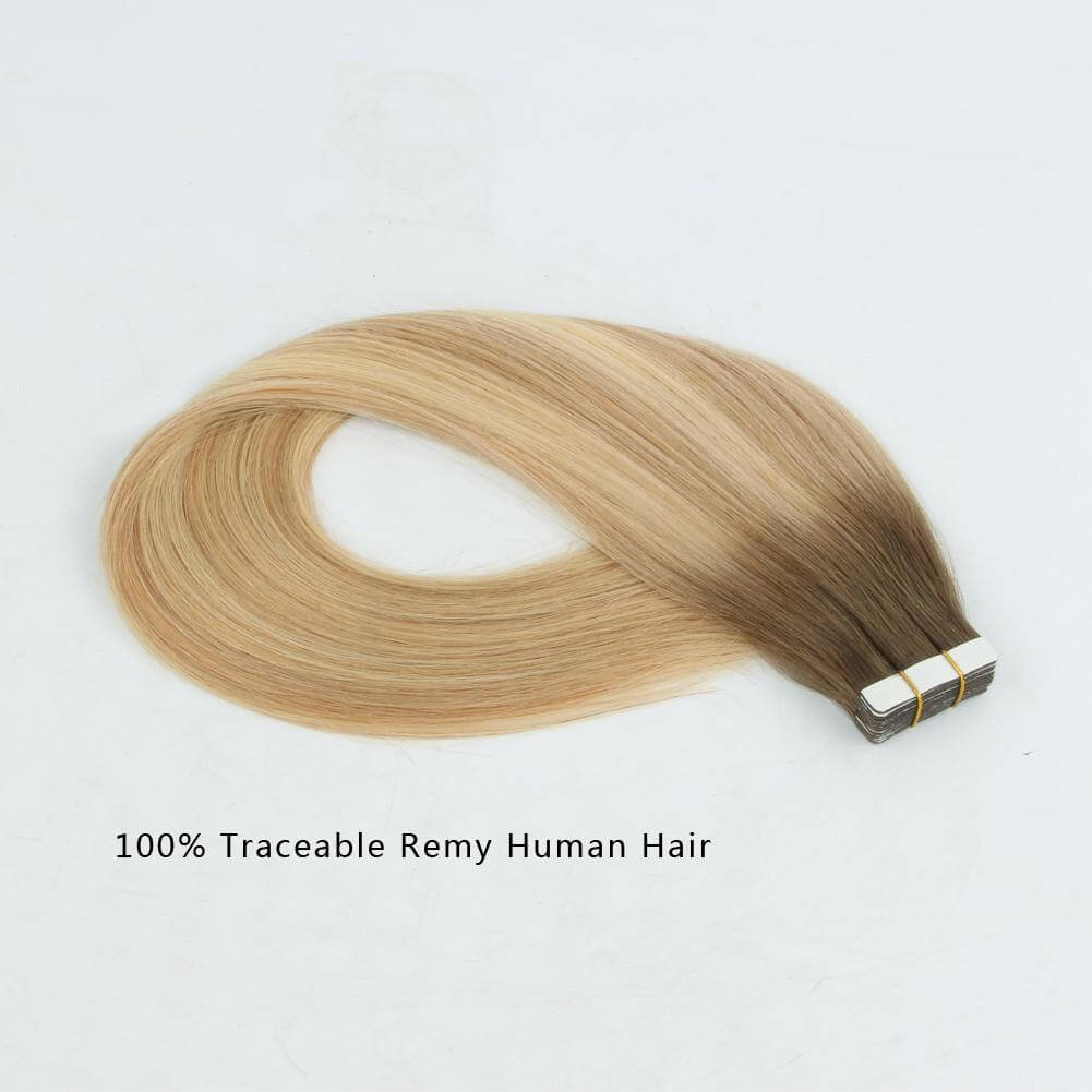 LuxuryYuan Chestnut Brown Color At Roots For Dirty Blonde Hair Extensions With Blonde Highlights, Semi-permanent Tape In Hair Extensions.